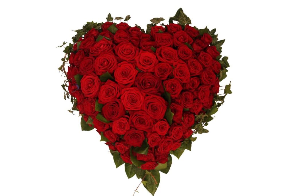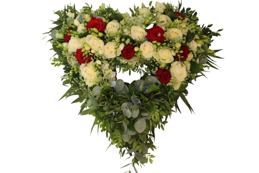 Åbent hjerte – bemærk der er blomster i den øverste halvdel af hjertet, den nederste halvdel er bundet med grønt.